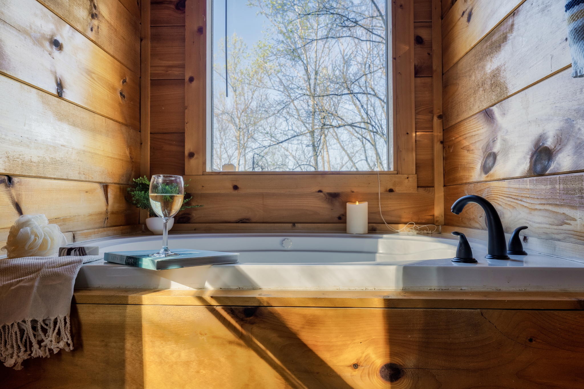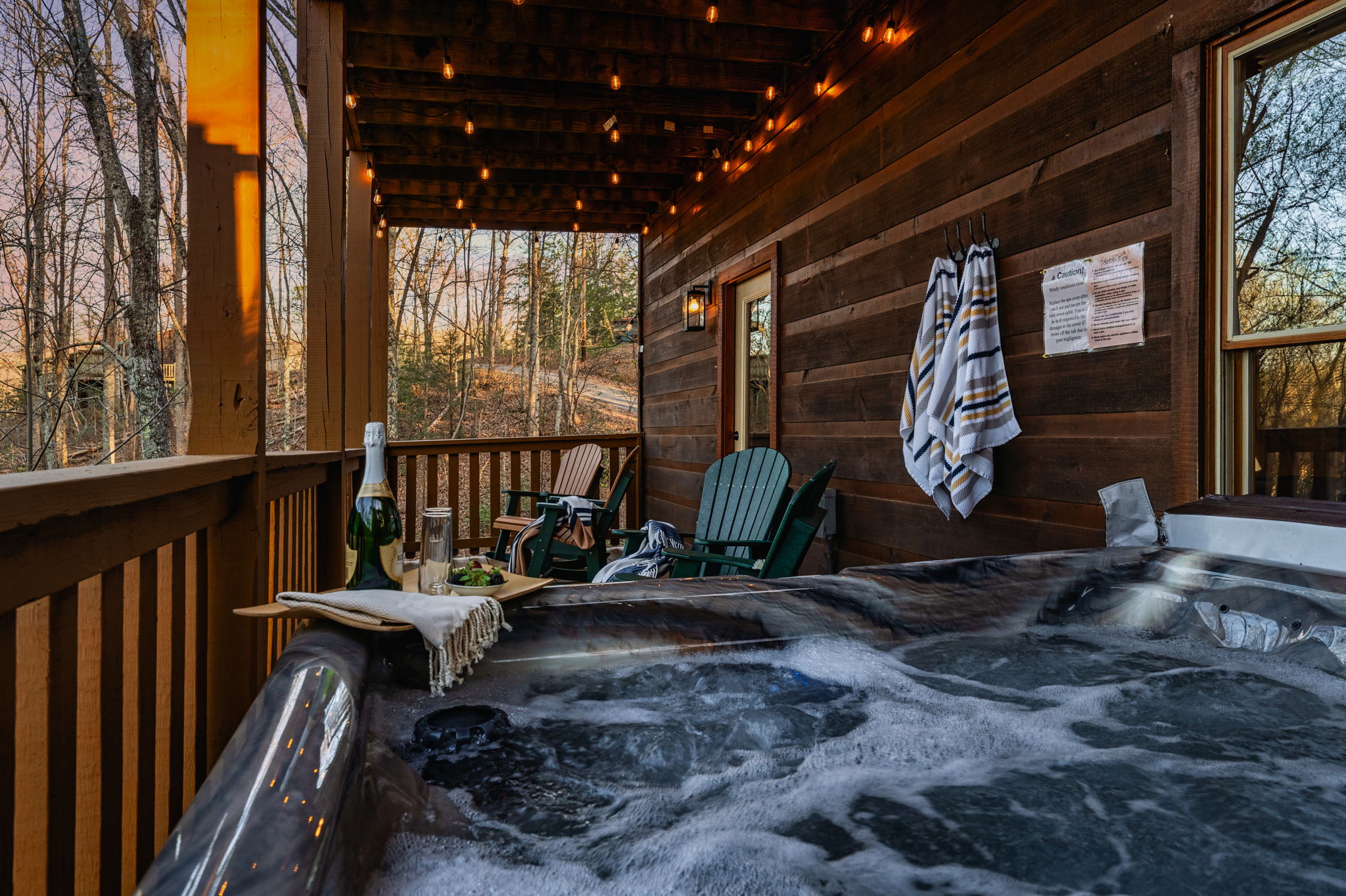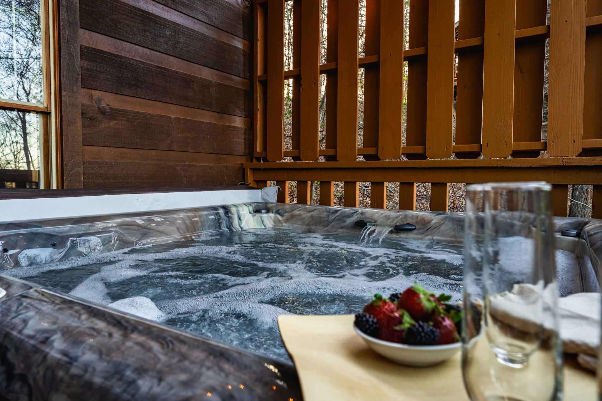 ▻ Relax in the hot tub with views of the trees